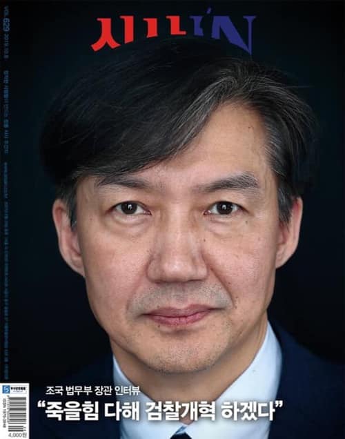 Photo: SisaIN magazine cover featuring the Justice Minister Cho Kuk, with the caption: "I would give my life for the prosecutorial reform." Credit: SisaIN.